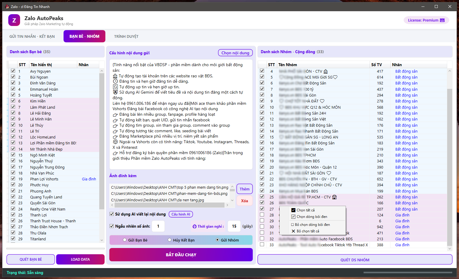 • Bước 3 – Chăm sóc Bạn bè/Nhóm: Tab Bạn bè – Nhóm -> Bấm Quét danh sách -> Chọn đối tượng cần gửi -> Cài đặt nội dung & ảnh -> Bấm Bắt đầu chạy.
